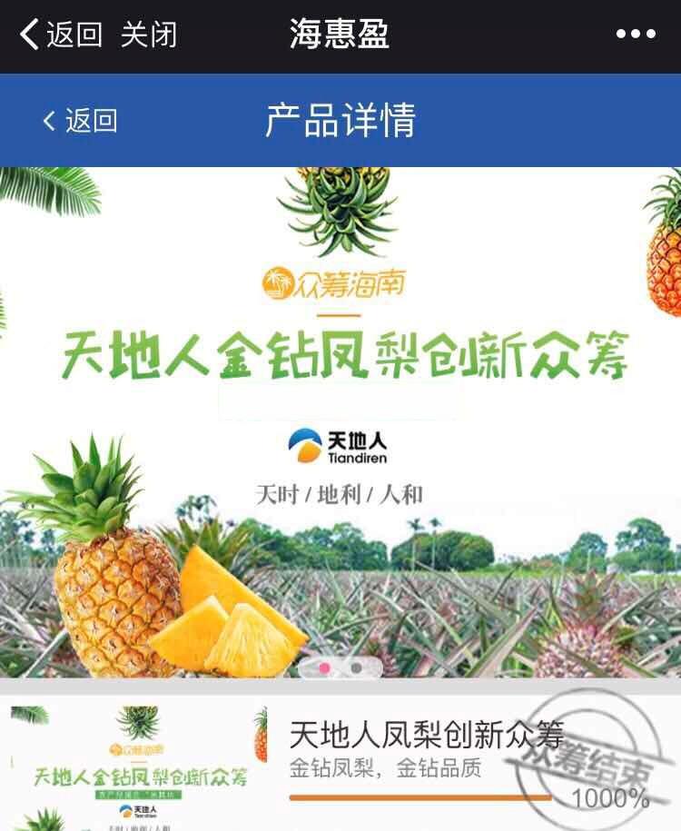 3月22日,海南股權(quán)交易中心天地人鳳梨創(chuàng)新眾籌項目圓滿結(jié)束,計劃眾籌金額10萬元,項目上線僅5分鐘,成功募集金額100萬元,是預(yù)期目標金額的10倍。天地人鳳梨眾籌項目,是股交中心2018年在海惠盈平臺上線的首單創(chuàng)新...