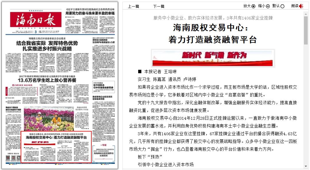 1月3日,海南日報頭版刊發(fā)報道——《海南股權(quán)交易中心:著力打造融資融智平臺》。報道回顧了股交中心成立三年來,在引領(lǐng)中小微企業(yè)進入資本市場、融資融智加速中小微企業(yè)發(fā)展、塑造中小微企業(yè)金融品牌等方面所走過的...