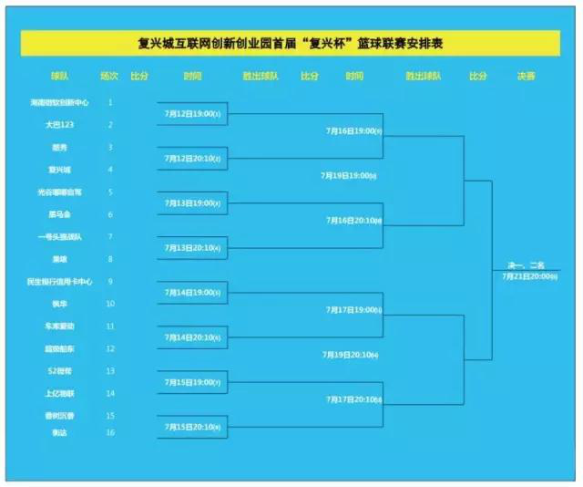 7月12日晚,2016年??谑袕?fù)興城互聯(lián)網(wǎng)創(chuàng)新創(chuàng)業(yè)園首屆“復(fù)興杯”籃球聯(lián)賽在??谑兰o(jì)公園籃球場揭幕。來自復(fù)興城創(chuàng)新創(chuàng)業(yè)園區(qū)16支隊(duì)伍展開為期10天的角逐。揭幕戰(zhàn)由海南微軟創(chuàng)新中心對陣大巴123,經(jīng)過爭奪,大巴123以66:53擊敗海南微軟創(chuàng)新中心;酷秀55:44勝復(fù)興城取得開門紅晉級(jí)下一輪。