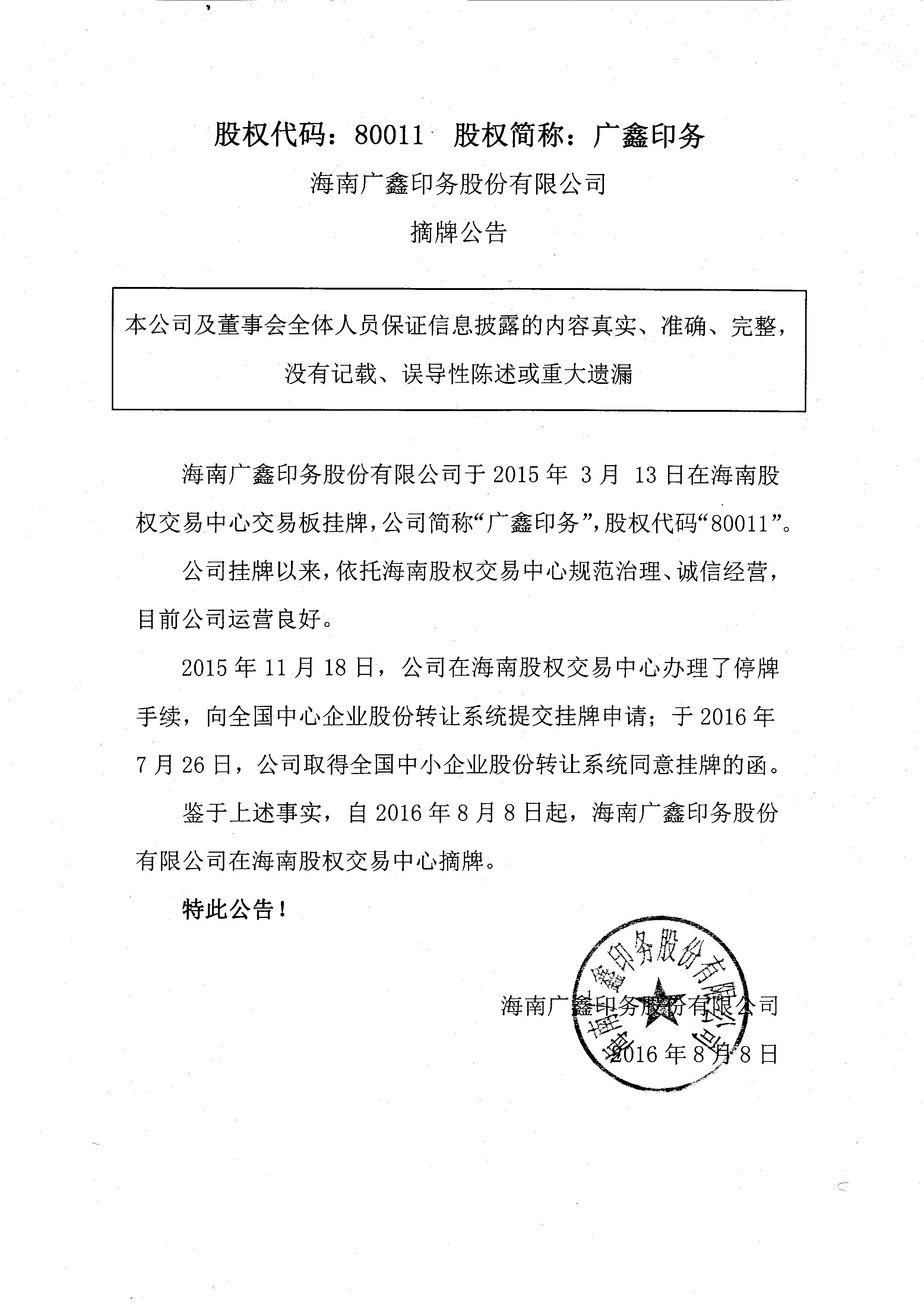 80011 廣鑫印務(wù):海南廣鑫印務(wù)股份有限公司摘牌公告