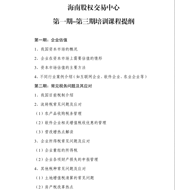 為幫助掛牌企業(yè)解決資金、稅收、以及管理上存在的諸多問題,提升企業(yè)的專業(yè)水平和管理水平,實(shí)現(xiàn)全方位成長壯大,海南股權(quán)交易中心(以下簡稱“股交中心”)掛牌企業(yè)培訓(xùn)班正式開班。首期培訓(xùn)班,股交中心特邀請中審亞太會計師事務(wù)所(特殊普通合伙)專家提供法律、財務(wù)和管理等方面的免費(fèi)培訓(xùn)服務(wù),通知如下: