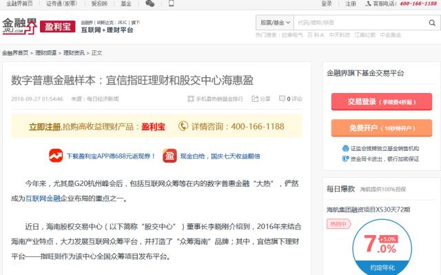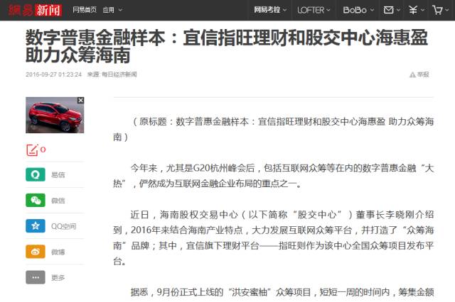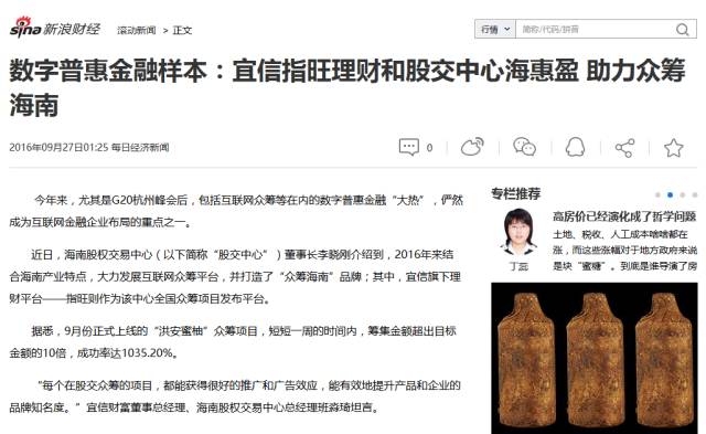9月23日,海南股權(quán)交易中心在椰城??谂e辦“數(shù)字金融在海南暨互聯(lián)網(wǎng)+農(nóng)業(yè)研討會(huì)”,研討會(huì)上討論了多項(xiàng)重要議題,尤其是“眾籌海南”項(xiàng)目,受到了高度關(guān)注。國(guó)內(nèi)主流財(cái)經(jīng)媒體《每日經(jīng)濟(jì)新聞》以《數(shù)字普惠金融樣本:宜信指旺理財(cái)和股交中心?;萦Ρ娀I海南》對(duì)本次研討會(huì)做了重要報(bào)道,文章刊發(fā)后,被新浪、網(wǎng)易、金融界、鳳凰、全景網(wǎng)、同花順財(cái)經(jīng)等主流媒體網(wǎng)站轉(zhuǎn)載。