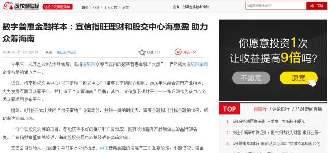 近日,海南股權(quán)交易中心(以下簡(jiǎn)稱“股交中心”)董事長(zhǎng)李曉剛介紹到,2016年來(lái)結(jié)合海南產(chǎn)業(yè)特點(diǎn),大力發(fā)展互聯(lián)網(wǎng)眾籌平臺(tái),并打造了“眾籌海南”品牌;其中,宜信旗下理財(cái)平臺(tái)——指旺則作為該中心全國(guó)眾籌項(xiàng)目發(fā)布平臺(tái)。