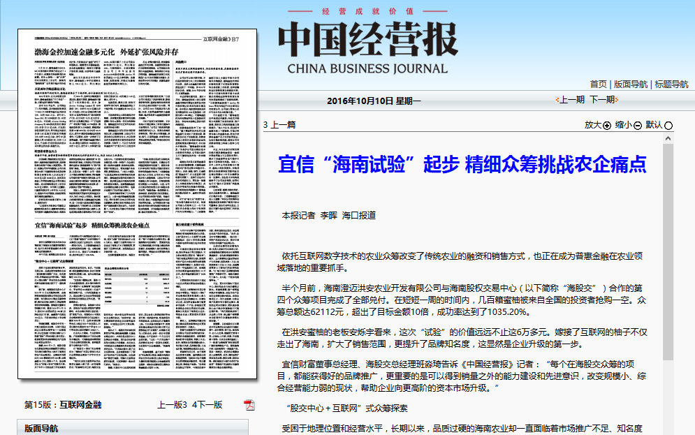 近日,國內(nèi)最早發(fā)行經(jīng)濟(jì)類的報刊之一《中國經(jīng)營報》在其互聯(lián)網(wǎng)金融版上報道“眾籌海南”,文章以《宜信“海南試驗(yàn)”起步 精細(xì)眾籌挑戰(zhàn)農(nóng)企痛點(diǎn)》為題,表示依托互聯(lián)網(wǎng)數(shù)字技術(shù)的農(nóng)業(yè)眾籌改變了傳統(tǒng)農(nóng)業(yè)的融資和銷售方式,也正在成為普惠金融在農(nóng)業(yè)領(lǐng)域落地的重要抓手。