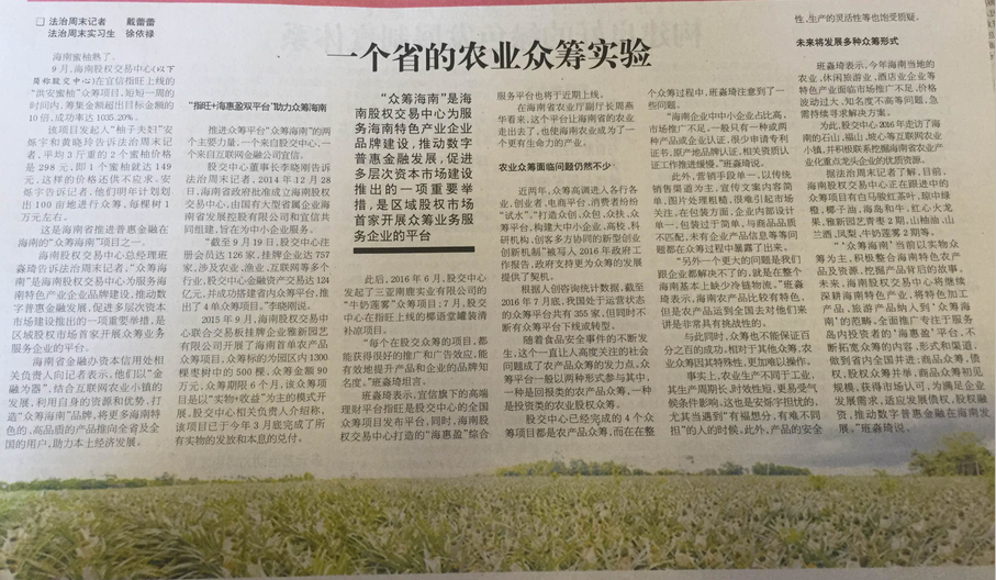 “眾籌海南”作為海南股權(quán)交易中心推動(dòng)海南特色產(chǎn)業(yè)發(fā)展的一項(xiàng)重要舉措,持續(xù)受到媒體關(guān)注。最近,面向全國(guó)公開(kāi)發(fā)行的具有鮮明法治特色的中央級(jí)主流政經(jīng)周報(bào)——《法治周末》以半版篇幅刊發(fā)了《一個(gè)省的農(nóng)業(yè)眾籌實(shí)驗(yàn)》專題文章。