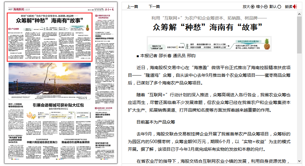 12月13日,海南日?qǐng)?bào)在經(jīng)濟(jì)版刊發(fā)文章《利用“互聯(lián)網(wǎng)+”為農(nóng)戶(hù)和企業(yè)籌資本、拓銷(xiāo)路、樹(shù)品牌——眾籌解“種愁”海南有“故事”》,大篇幅報(bào)道了海南股權(quán)交易中心“眾籌海南”。