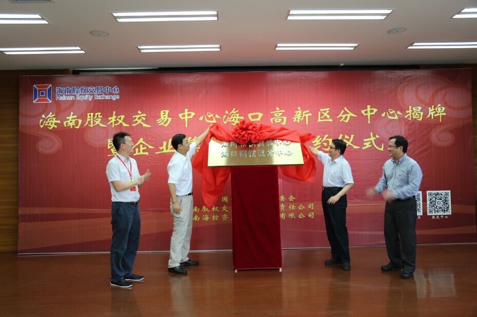 隨后,省科技廳黨組書記葉振興書記、省金融辦鄧傳明主任、海口國家高新區(qū)黨委書記顧剛書記和海南股交中心李曉剛董事長共同為海南股權交易中心高新區(qū)分中心揭牌。