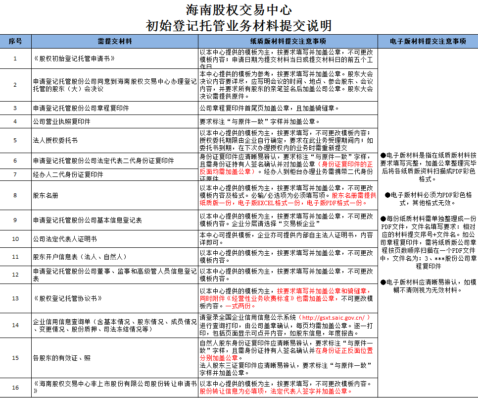 海南股權(quán)交易中心初始登記托管業(yè)務(wù)材料提交說明
