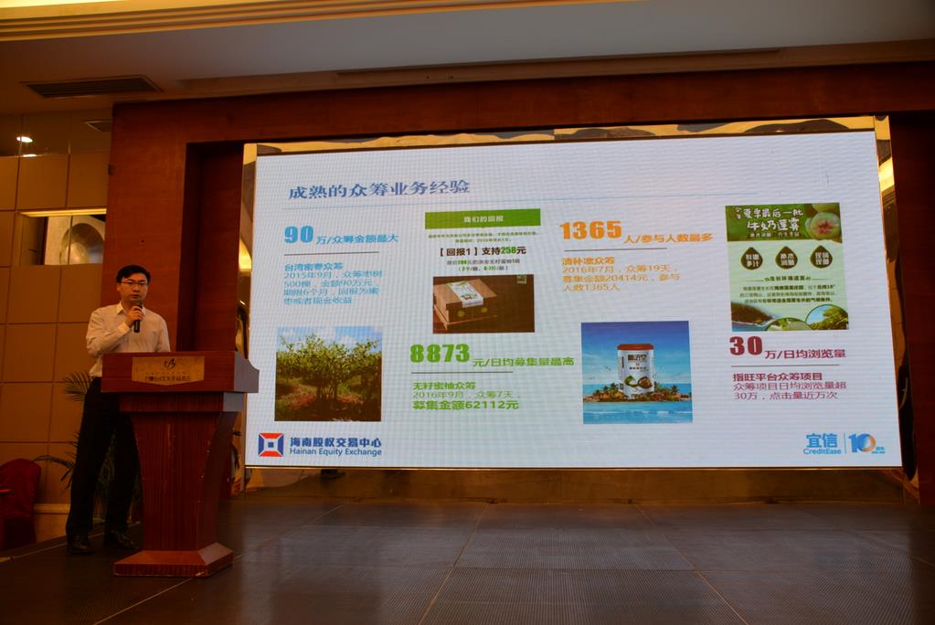 隨后,股交中心副總經(jīng)理程棟才就2017年度“眾籌海南,訂制農(nóng)旅”項目情況及具體內容作了詳細的介紹,指出此次股交中心推出“眾籌海南,訂制農(nóng)旅”項目目的在于聚焦海南特色資源,推廣海南特色農(nóng)產(chǎn)品,促進農(nóng)旅融合,進一步推動企業(yè)發(fā)展。