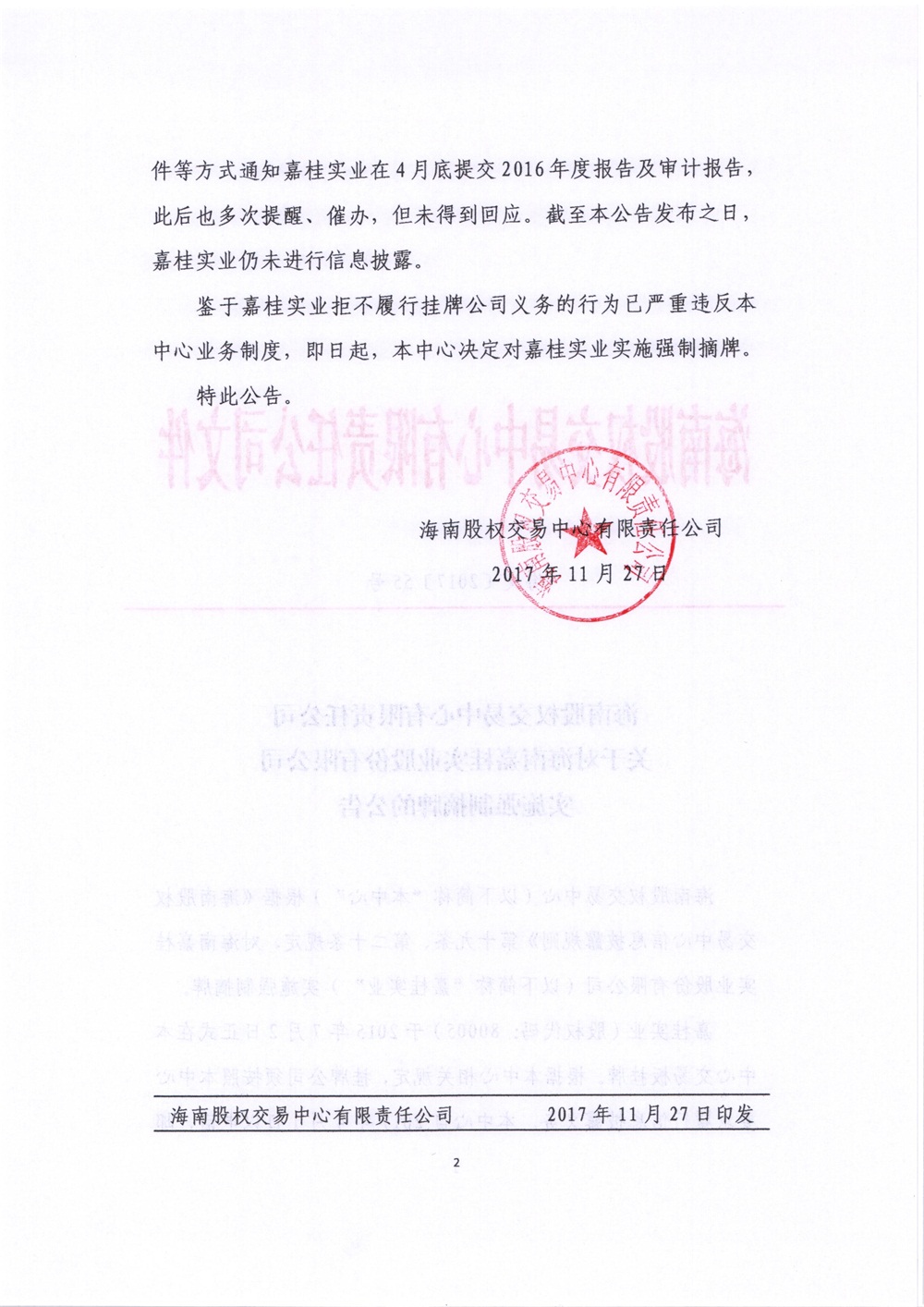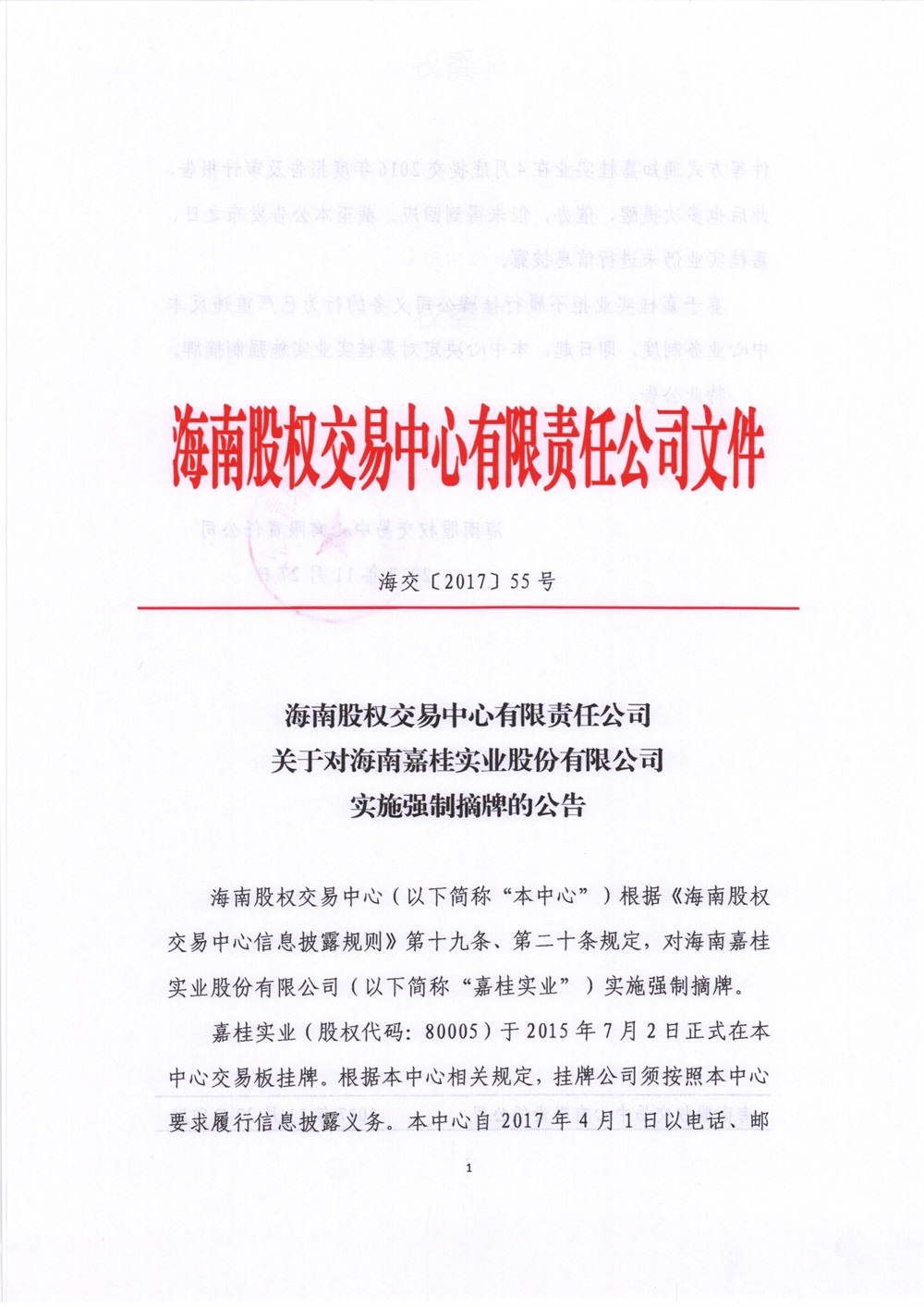 80005嘉桂實業(yè):關于對海南嘉桂實業(yè)股份有限公司實施強制摘牌的公告