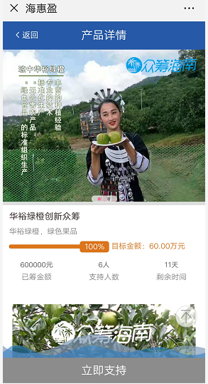 本單創(chuàng)新眾籌以綠橙為產(chǎn)品標(biāo)的,不同于?;萦脚_其他實物眾籌的實物類的回報方案,此次綠橙眾籌項目提供“實物”和“代銷收益”兩種回報方案,產(chǎn)品存續(xù)期為14個月,即產(chǎn)品到期日是2020年1月份,認(rèn)籌用戶到期可根據(jù)認(rèn)籌時選擇的回報方案獲得相應(yīng)的回報。