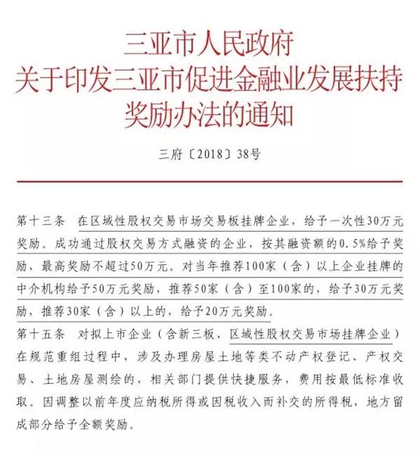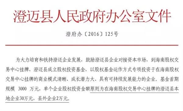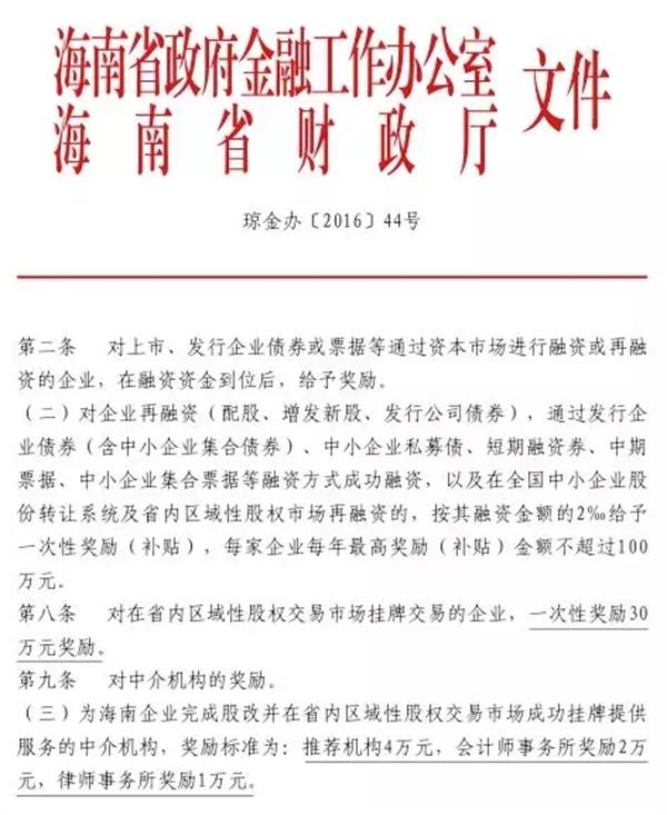 在國家采取精準有效措施大力支持中小微企業(yè)發(fā)展,解決中小微企業(yè)融資難、融資貴難題的大背景下。從2015年開始,海南省各級政府密集出臺鼓勵企業(yè)掛牌區(qū)域性股權(quán)交易市場(即四板市場)的政策。同時,在股份改制、掛牌、融資等方面,給予掛牌企業(yè)財政獎勵,以實際行動助力中小微企業(yè)對接資本市場,做大做強。