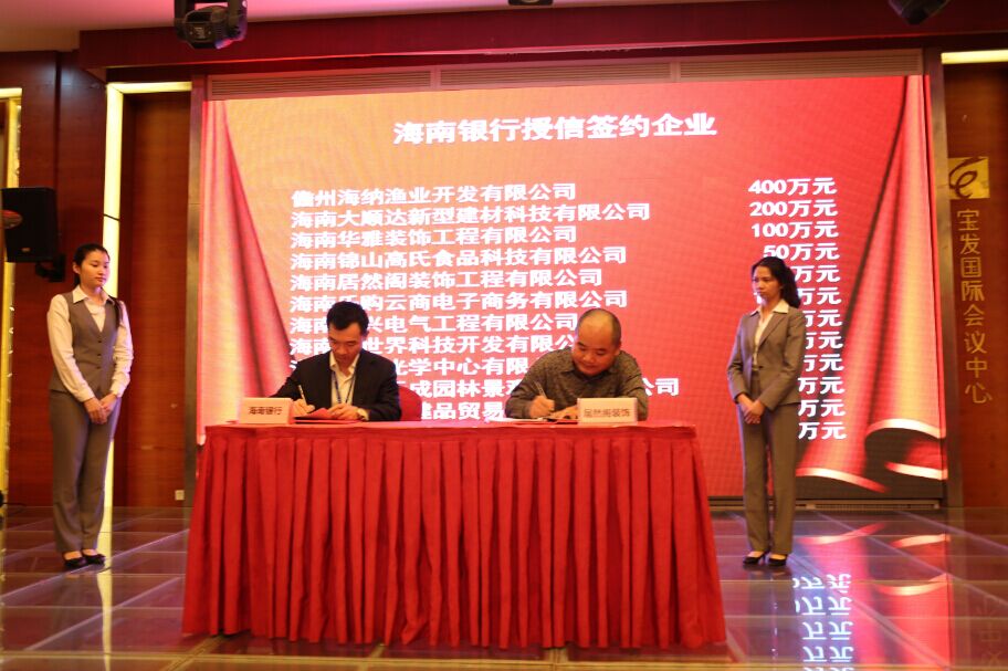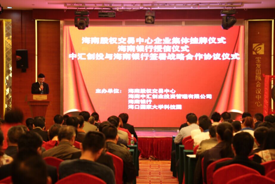 1月15日,海南股權(quán)交易中心企業(yè)集體掛牌暨銀行授信簽約儀式,在??趯毎l(fā)幸福酒店舉行。本次活動由海南股權(quán)交易中心、海南中匯創(chuàng)業(yè)投資管理有限公司、海南銀行、??趪掖髮W(xué)科技園聯(lián)合主辦。37家企業(yè)現(xiàn)場集體掛牌海南股權(quán)交易中心,其中12家企業(yè)獲得海南銀行合計(jì)額度2100萬元的授信。