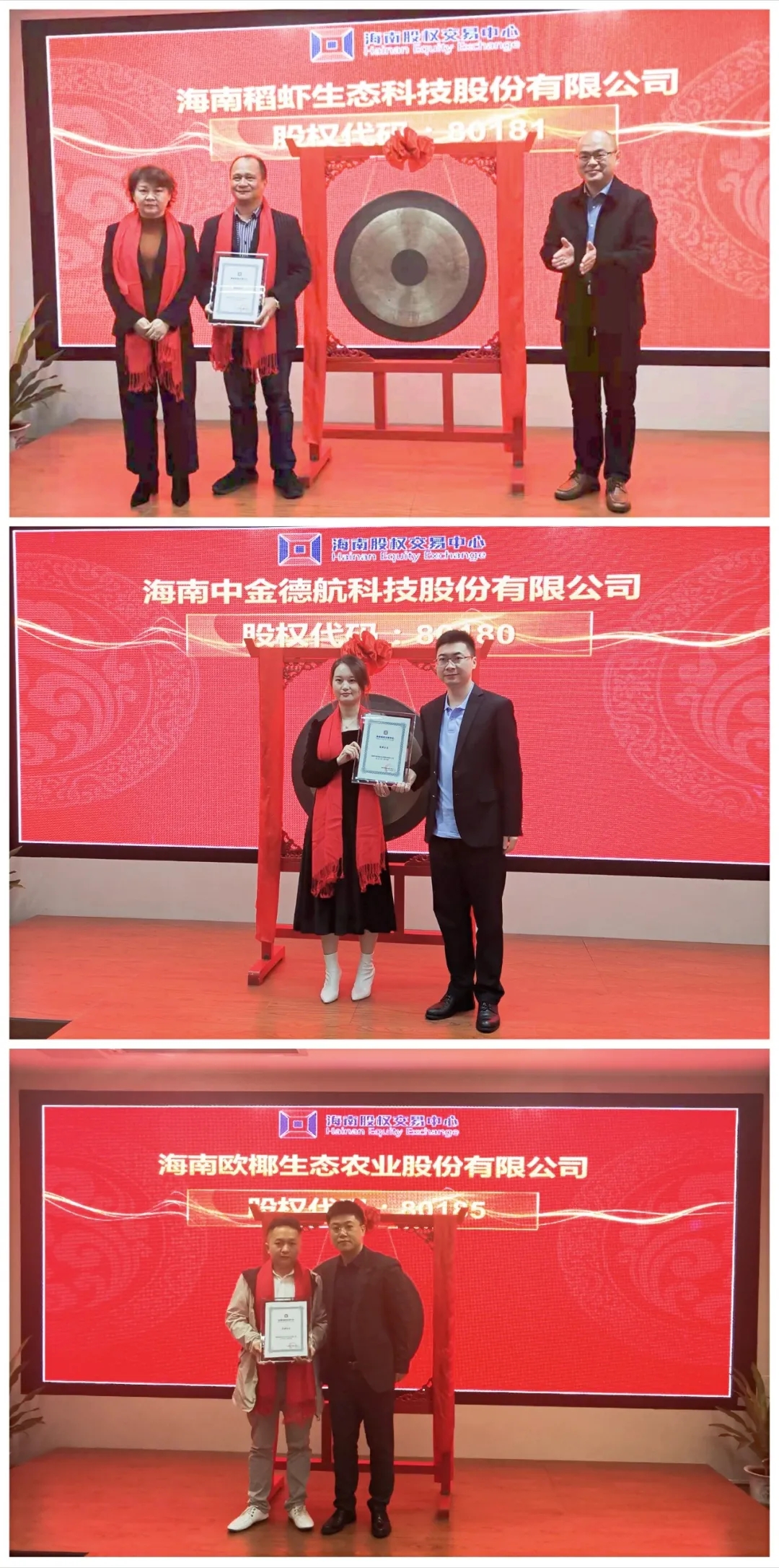 在企業(yè)集體掛牌儀式上,海南稻蝦生態(tài)科技股份有限公司、海南中金德航科技股份有限公司、海南歐椰生態(tài)農(nóng)業(yè)股份有限公司等3家優(yōu)質企業(yè)敲響了掛牌的鑼聲,正式登陸海南股交交易板。海南股交作為多層次資本市場的重要一環(huán),將竭力為掛牌企業(yè)提供融資、規(guī)范、培育等多方面的服務,為企業(yè)對接多層次資本市場打下堅實的基礎。