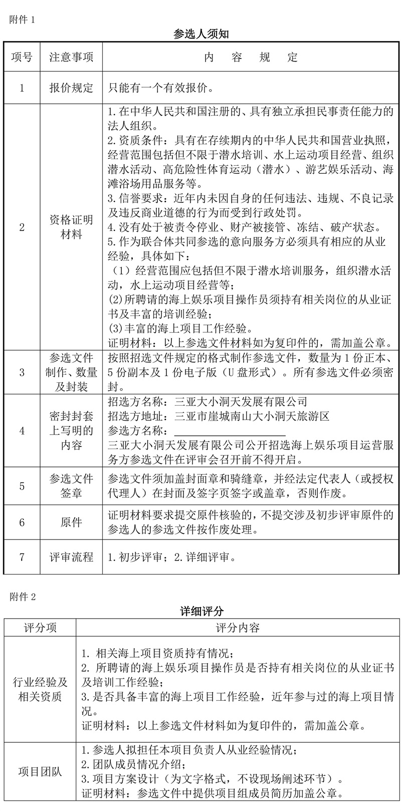 根據(jù)相關(guān)法律法規(guī),受委托,海南股權(quán)交易中心有限責(zé)任公司公開招選海上娛樂項目運營服務(wù)方,為三亞大小洞天景區(qū)的海上娛樂項目提供盡職調(diào)查、方案設(shè)計、項目報批、安裝、調(diào)試、驗收及運營管理等服務(wù)工作。歡迎符合條件的機構(gòu)遵照本公告的有關(guān)規(guī)定報名參加,現(xiàn)將有關(guān)事項公告如下: