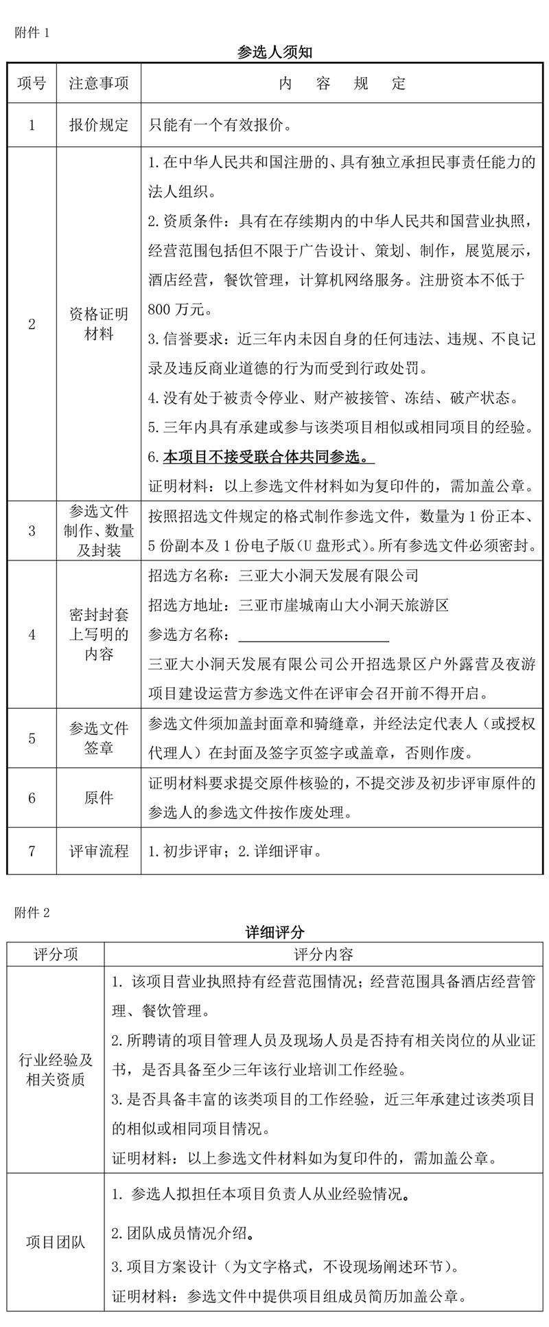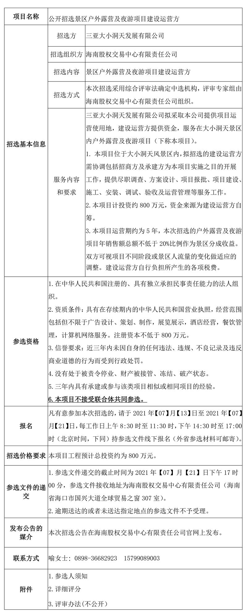 根據(jù)相關(guān)法律法規(guī),受委托,海南股權(quán)交易中心有限責(zé)任公司公開招選景區(qū)戶外露營及夜游項目建設(shè)運(yùn)營方,為三亞大小洞天景區(qū)的戶外露營及夜游項目提供盡職調(diào)查、方案設(shè)計、項目報批、項目建設(shè)、施工、安裝、調(diào)試、驗收及運(yùn)營管理等服務(wù)工作。歡迎符合條件的機(jī)構(gòu)遵照本公告的有關(guān)規(guī)定報名參加,現(xiàn)將有關(guān)事項公告如下: