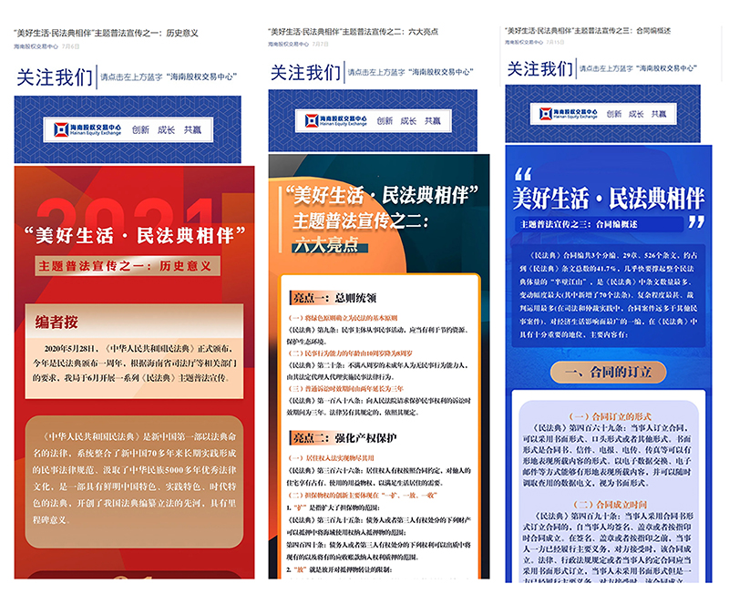 2021年7月7日-29日期間,海南股交通過邀請知名專家、投資機(jī)構(gòu)進(jìn)行線上授課和微信公眾號平臺轉(zhuǎn)發(fā)“民法典主題普法宣傳”等形式,開展企業(yè)培育宣傳活動。其中,線上課程向掛牌公司、展示企業(yè)、托管企業(yè)尤其是“專精特新”企業(yè)定向邀約,邀請企業(yè)代表參加《“商業(yè)計劃書”系列課程》兩堂線上直播課,直播課在線參與人數(shù)922名,活動取得了良好效果。
