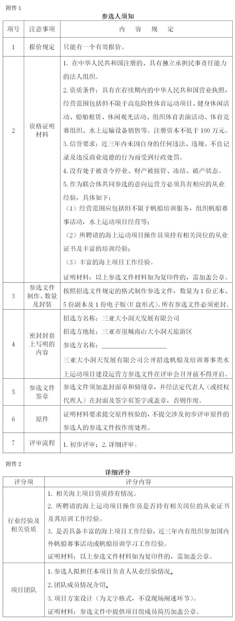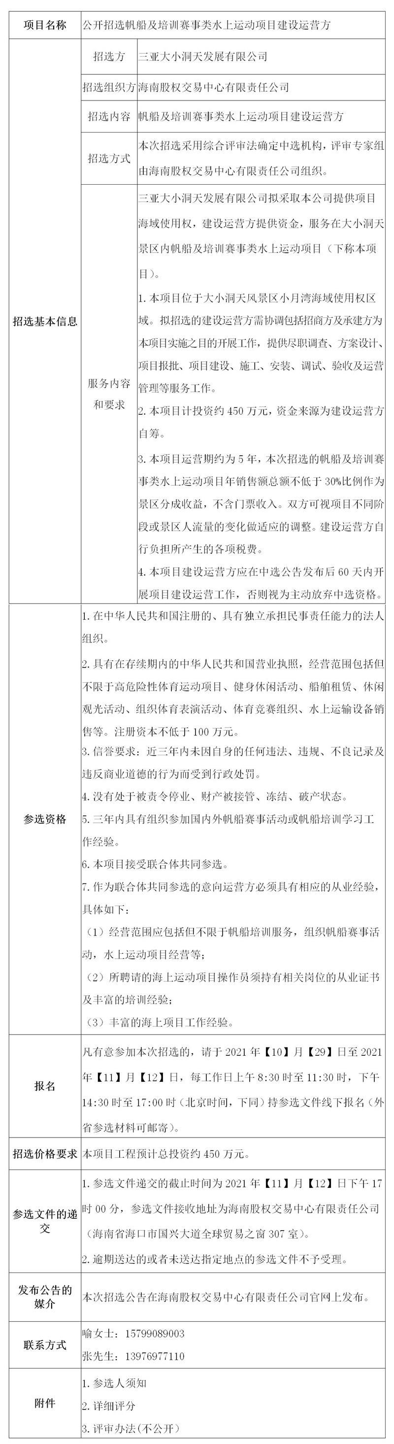 根據(jù)相關(guān)法律法規(guī),受委托,海南股權(quán)交易中心有限責(zé)任公司公開招選帆船及培訓(xùn)賽事類水上運動項目建設(shè)運營方,為三亞大小洞天景區(qū)的帆船及培訓(xùn)賽事類水上運動項目提供盡職調(diào)查、方案設(shè)計、項目報批、項目建設(shè)、施工、安裝、調(diào)試、驗收及運營管理等服務(wù)工作。歡迎符合條件的機(jī)構(gòu)遵照本公告的有關(guān)規(guī)定報名參加,現(xiàn)將有關(guān)事項公告如下: