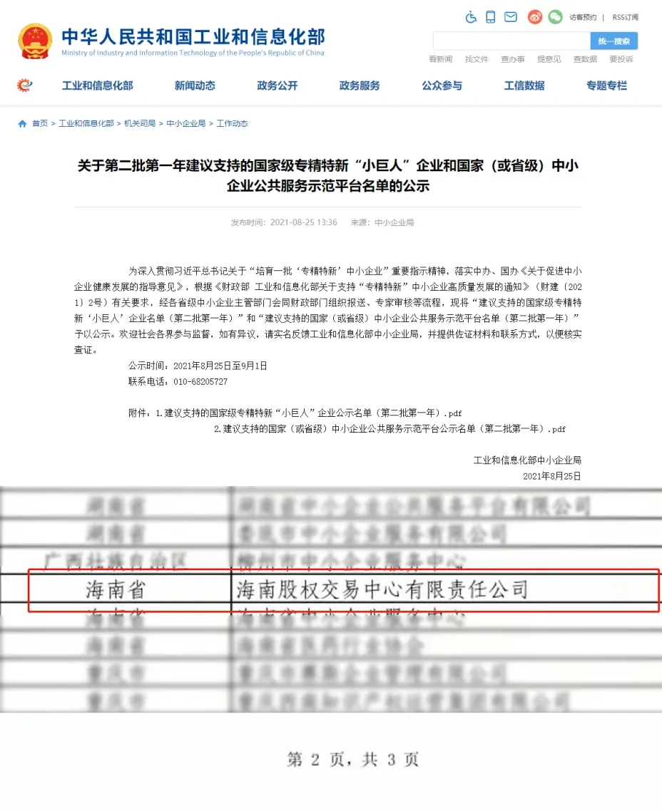 2021年8月,海南股交入選第二批“建議支持的國家(或省級)中小企業(yè)公共服務(wù)示范平臺”名單。證明了海南股交服務(wù)“專精特新”中小企業(yè)的能力獲得了工信部及省工信廳的認可。
