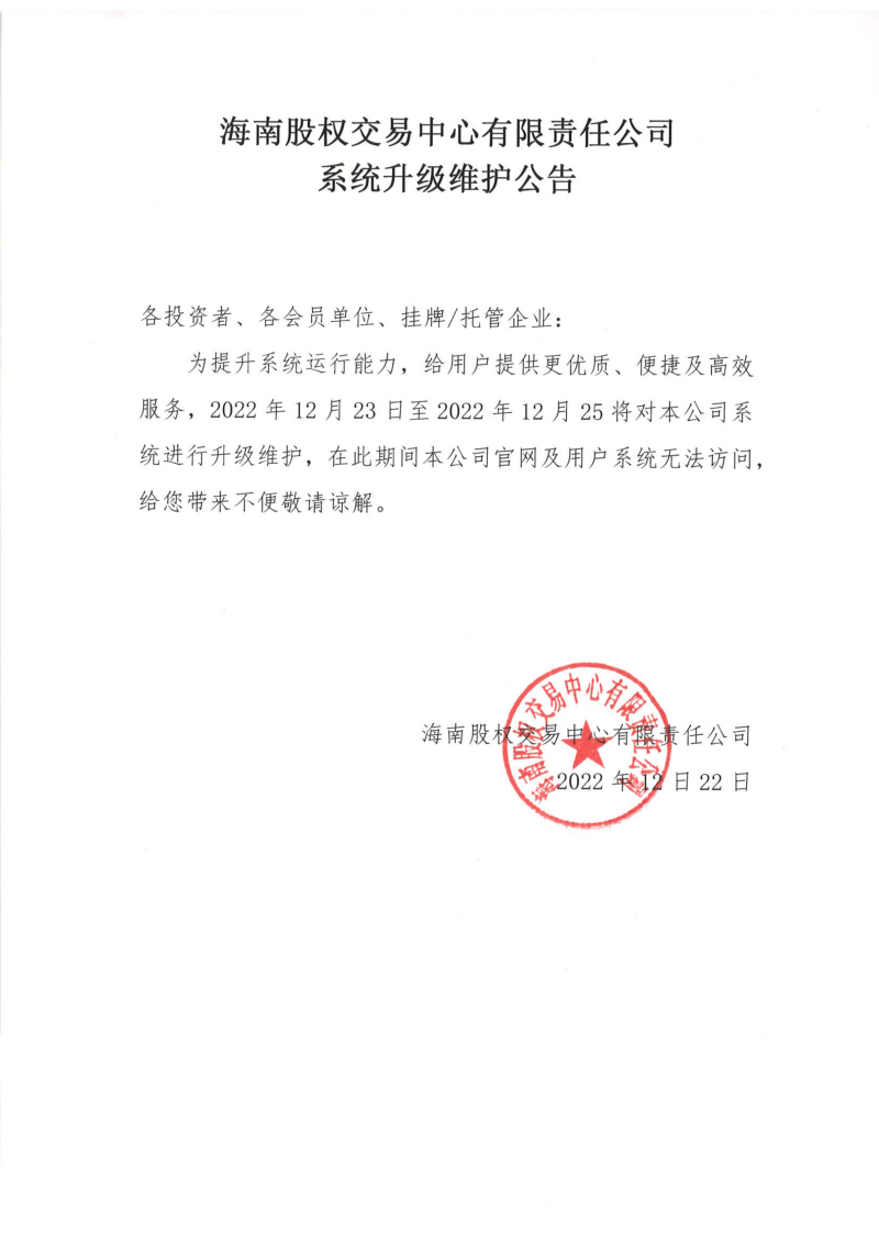 海南股權(quán)交易中心有限責(zé)任公司系統(tǒng)升級(jí)維護(hù)公告