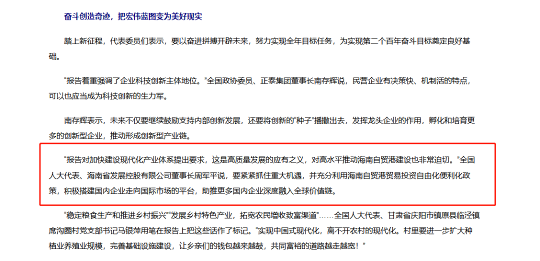 “報告對加快建設(shè)現(xiàn)代化產(chǎn)業(yè)體系提出要求,這是高質(zhì)量發(fā)展的應(yīng)有之義,對高水平推動海南自貿(mào)港建設(shè)也非常迫切。”全國人大代表、海南省發(fā)展控股有限公司董事長周軍平說,要緊緊抓住重大機遇,并充分利用海南自貿(mào)港貿(mào)易投資自由化便利化政策,積極搭建國內(nèi)企業(yè)走向國際市場的平臺,助推更多國內(nèi)企業(yè)深度融入全球價值鏈。