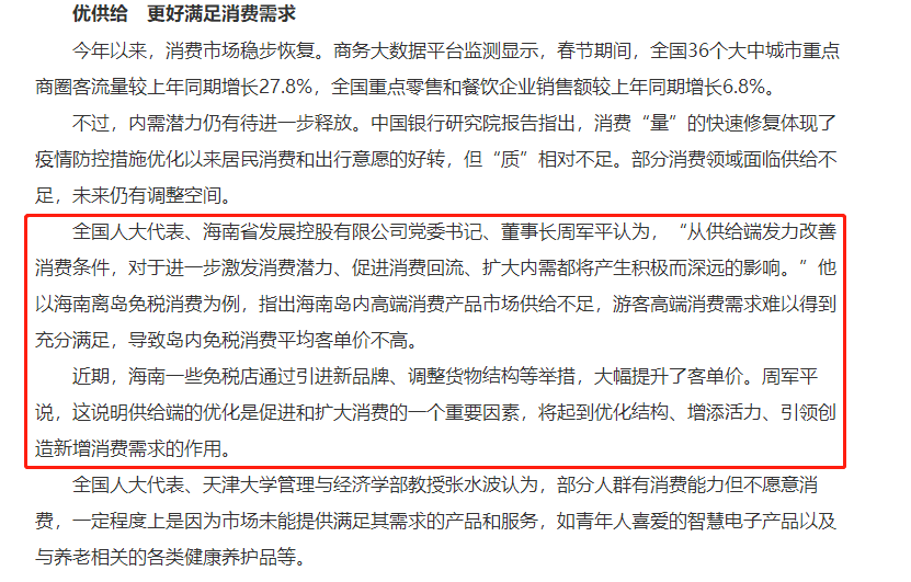 報道圍繞“如何讓消費‘熱’起來?怎樣解決不便消費、不愿消費、不敢消費等突出問題以釋放消費潛力?”采訪全國兩會代表委員。報道提及:全國人大代表、海南省發(fā)展控股有限公司黨委書記、董事長周軍平認(rèn)為,“從供給端發(fā)力改善消費條件,對于進一步激發(fā)消費潛力、促進消費回流、擴大內(nèi)需都將產(chǎn)生積極而深遠(yuǎn)的影響?!彼院D想x島免稅消費為例,指出海南島內(nèi)高端消費產(chǎn)品市場供給不足,游客高端消費需求難以得到充分滿足,導(dǎo)致島內(nèi)免稅消費平均客單價不高。近期,海南一些免稅店通過引進新品牌、調(diào)整貨物結(jié)構(gòu)等舉措,大幅提升了客單價。周軍平說,這說明供給端的優(yōu)化是促進和擴大消費的一個重要因素,將起到優(yōu)化結(jié)構(gòu)、增添活力、引領(lǐng)創(chuàng)造新增消費需求的作用。