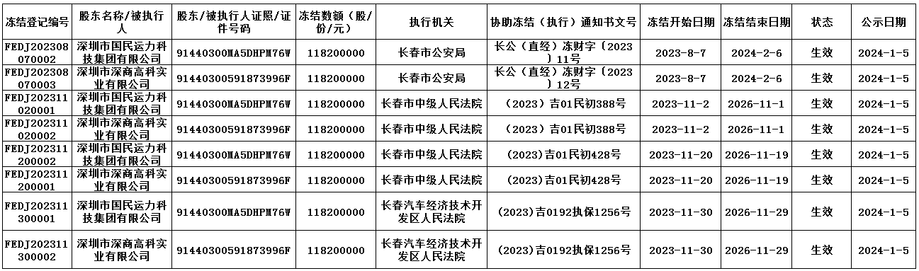 依據(jù)長(zhǎng)春市公安局《協(xié)助凍結(jié)財(cái)產(chǎn)通知書(shū)》[長(zhǎng)公(直經(jīng))凍財(cái)字〔2023〕11號(hào))]、長(zhǎng)春市人民法院《協(xié)助執(zhí)行通知書(shū)》[(2023)吉01民初388號(hào)]及長(zhǎng)春汽車經(jīng)濟(jì)技術(shù)開(kāi)發(fā)區(qū)人民法院[(2023)吉0192執(zhí)保1256號(hào)]等文件,我中心為??诼?lián)合農(nóng)村商業(yè)銀行股份有限公司(企業(yè)代碼:893529)股東深圳市國(guó)民運(yùn)力科技集團(tuán)有限公司、深圳市深商高科實(shí)業(yè)有限公司辦理股權(quán)凍結(jié)/股權(quán)輪候凍結(jié)登記,具體情況如下: