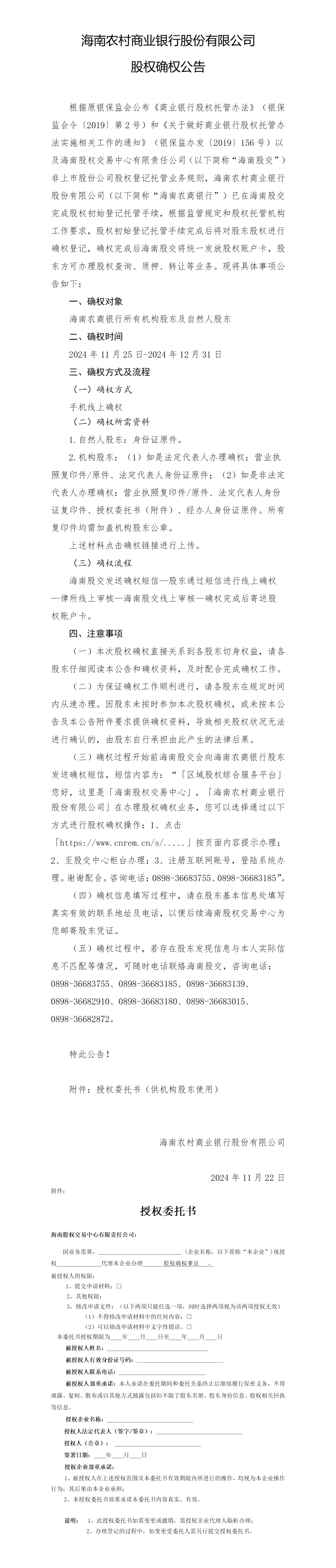 海南農(nóng)村商業(yè)銀行股份有限公司股權(quán)確權(quán)公告