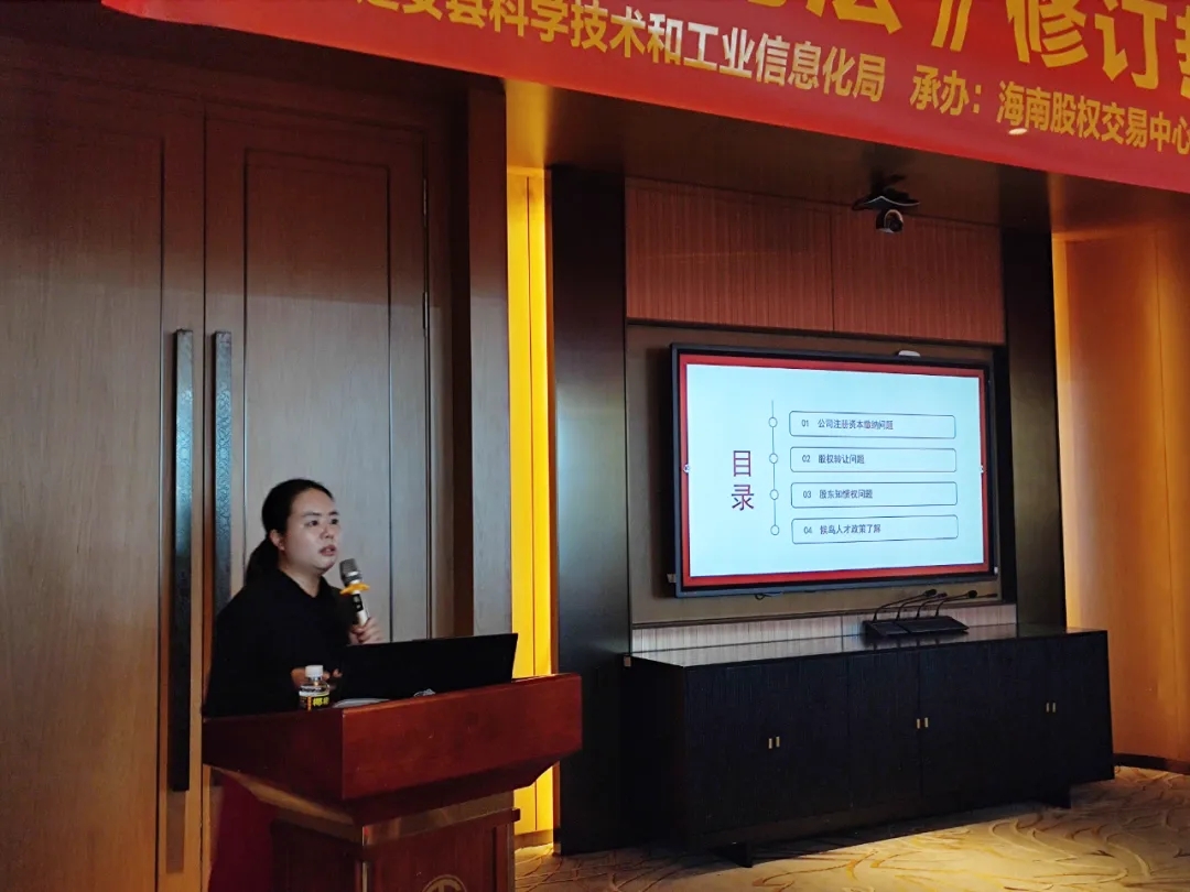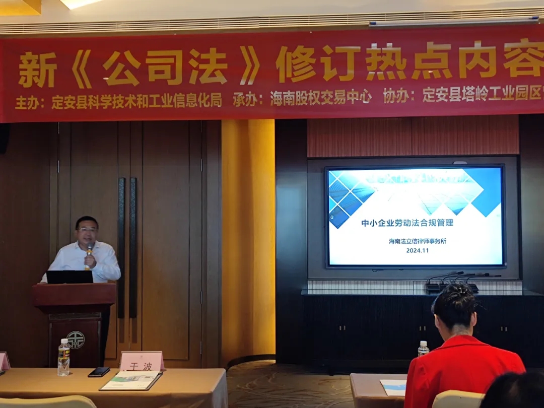 本次培訓(xùn)旨在深入解讀新《公司法》修訂熱點(diǎn)內(nèi)容和《勞動法》的核心內(nèi)容,探討企業(yè)合規(guī)管理策略,助力企業(yè)健康發(fā)展。活動由定安縣科學(xué)技術(shù)和工業(yè)信息化局主辦,海南股權(quán)交易中心承辦,定安縣塔嶺工業(yè)園區(qū)管理委員會、定安縣工商業(yè)聯(lián)合會協(xié)辦,海南法立信律師事務(wù)所提供支持。