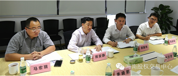 4月13日下午,由海南省人民政府研究室副主任熊安靜帶隊的省金融辦、省旅游委調(diào)研組一行,到海南股權(quán)交易中心走訪調(diào)研。海南股權(quán)交易中心董事長李曉剛,組織各部門負責人召開座談會,詳細介紹了本中心的運行情況。