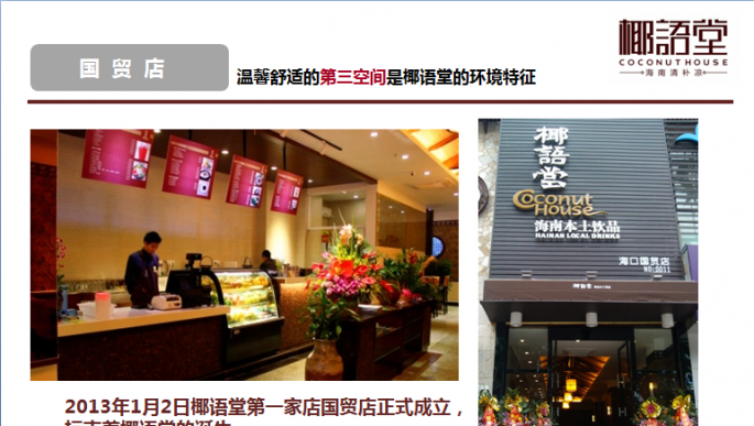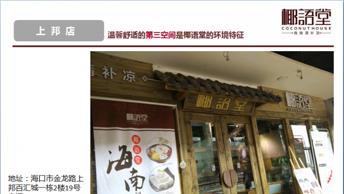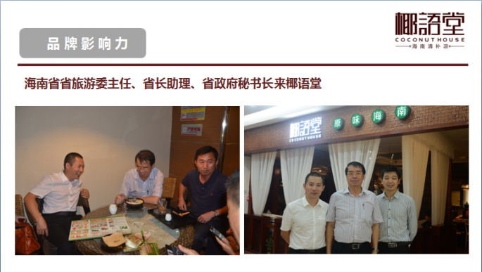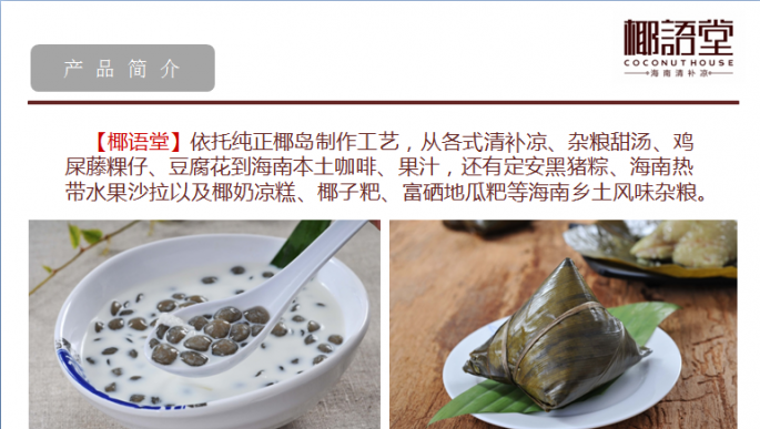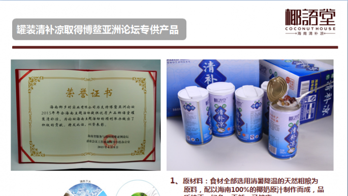 海南椰鄉(xiāng)村實(shí)業(yè)有限公司是海南省工商行政管理局批準(zhǔn)成立的有限責(zé)任公司,公司注冊(cè)資金2300萬(wàn),在職員工103人。公司下轄全資子公司海口椰語(yǔ)堂餐飲文化有限公司及??谝Z(yǔ)堂食品營(yíng)養(yǎng)科學(xué)研究院。公司根據(jù)發(fā)展目前分為三個(gè)事業(yè)部:椰語(yǔ)堂店面連鎖事業(yè)部、產(chǎn)品事業(yè)部、椰語(yǔ)堂食品營(yíng)養(yǎng)科學(xué)研究院。椰語(yǔ)堂店面連鎖事業(yè)部主要負(fù)責(zé)椰語(yǔ)堂連鎖店面的擴(kuò)張和關(guān)聯(lián)產(chǎn)業(yè)的拓展業(yè)務(wù);產(chǎn)品事業(yè)部主要負(fù)責(zé)以罐裝清補(bǔ)涼等快消品市場(chǎng)的開(kāi)拓,如目前所進(jìn)行的椰語(yǔ)堂椰奶清補(bǔ)涼工業(yè)化項(xiàng)目就是最具代表性的一項(xiàng)研究工作;椰語(yǔ)堂食品營(yíng)養(yǎng)科學(xué)研究院主要為椰語(yǔ)堂本身和第三方進(jìn)行有關(guān)食品營(yíng)養(yǎng)、配餐、產(chǎn)品研發(fā)等方面的工作,未來(lái)是椰語(yǔ)堂核心競(jìng)爭(zhēng)力的重要部分。 椰語(yǔ)堂是海南首家把海南本土以清補(bǔ)涼為代表的小吃精致化、系統(tǒng)化、標(biāo)準(zhǔn)化和研發(fā)體系化并進(jìn)行連鎖發(fā)展的企業(yè),公司致力于傳播海南文化、打造海南本土休閑美食的第一品牌。公司成立于2012年,并創(chuàng)立【椰語(yǔ)堂】品牌, 現(xiàn)已在海南望海國(guó)際廣場(chǎng)、南亞廣場(chǎng)、中山路騎樓老街、美蘭國(guó)際機(jī)場(chǎng)、上邦商業(yè)廣場(chǎng)、天涯海角景區(qū)、??谀蟻啅V場(chǎng)、廣東中山市、海口國(guó)貿(mào)大道正昊店、三亞亞龍灣熱帶天堂森林公園、??谟颜x廣場(chǎng)店等地開(kāi)設(shè)11家連鎖店并開(kāi)始北京、天津、遼寧、江蘇等島外市場(chǎng)的拓展,由于其濃郁的海南本土特色和優(yōu)秀的品質(zhì)感受到社會(huì)各界的廣泛好評(píng),椰語(yǔ)堂椰奶清補(bǔ)涼等六款小吃被餐飲行業(yè)權(quán)威機(jī)構(gòu)海南省烹飪協(xié)會(huì)、海南省瓊菜研究中心評(píng)為海南名小吃和海南瓊菜(風(fēng)味小吃)一級(jí)品牌名店。央視CCTV-2、旅游衛(wèi)視、海南電視臺(tái)、內(nèi)蒙衛(wèi)視、海南日?qǐng)?bào)、航空高端雜志【云端】、中國(guó)美食第一刊【東方美食】【餐飲經(jīng)理人】、【勇闖地球主持人伊恩.萊特】、【新浪美食】、【南島視界】、【海南旅游商品協(xié)會(huì)雜志創(chuàng)刊號(hào)】、去哪兒吃【海南美食】食尚海南等國(guó)內(nèi)外知名媒體都進(jìn)行了宣 傳報(bào)道,成為了海南文化的傳播和弘揚(yáng)者,并打造成展示海南國(guó)際旅游島本土文化的一張亮麗名片。 海南椰鄉(xiāng)村實(shí)業(yè)有限公司注冊(cè)成立了“??谝Z(yǔ)堂食品營(yíng)養(yǎng)科學(xué)研究院”并和海南大學(xué)食品學(xué)院深度合作,充分利用海南大學(xué)食品學(xué)院的科研力量和實(shí)驗(yàn)設(shè)備,集結(jié)了海南大學(xué)和其它領(lǐng)域的教授、專(zhuān)家,進(jìn)行產(chǎn)品的研發(fā)和標(biāo)準(zhǔn)的制定,定期進(jìn)行營(yíng)養(yǎng)成分抽檢和出品品質(zhì)監(jiān)控,旨在為消費(fèi)者提供食品更加安全、營(yíng)養(yǎng)更加豐富、品種更加齊全的海南本土特色休閑美食。 2014年,政府為發(fā)展海南省地方特色產(chǎn)業(yè),從眾多的申報(bào)項(xiàng)目中篩選后對(duì)我司進(jìn)行了300萬(wàn)人民幣股權(quán)投資。 2014年12月,我司受邀參加2014年中國(guó)(海南)國(guó)際熱帶農(nóng)產(chǎn)品冬季交易會(huì),我司推出的“椰語(yǔ)堂罐裝清補(bǔ)涼”在海南省品牌館和??谑衅放起^進(jìn)行展示。本產(chǎn)品原材料全部選用消暑降溫的天然粗糧為原料,配以海南100%的椰奶原汁制作而成,品質(zhì)純正、綠色、天然又健康,清涼可口、營(yíng)養(yǎng)又健康。通過(guò)此次展會(huì),“椰語(yǔ)堂罐裝清補(bǔ)涼”贏得了島內(nèi)外顧客的一致好評(píng),成為此次冬交會(huì)上獨(dú)具一格的風(fēng)景。 2015年3月,我司“椰語(yǔ)堂罐裝清補(bǔ)涼”正式成為亞洲博鰲論壇專(zhuān)供產(chǎn)品,為世界各國(guó)領(lǐng)導(dǎo)人所品用。 目前在??跈C(jī)場(chǎng)、??谥寥齺唲?dòng)車(chē)、廣深高鐵、部分商場(chǎng)、淘寶等互聯(lián)網(wǎng)渠道已經(jīng)開(kāi)始椰語(yǔ)堂灌裝清補(bǔ)涼產(chǎn)品的銷(xiāo)售。 |
